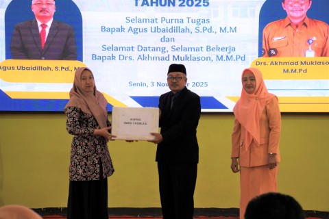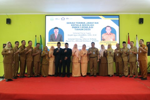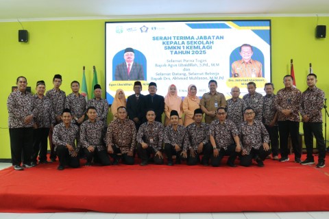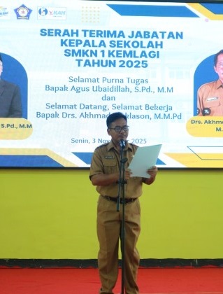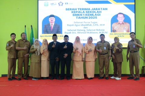 Kemlagi, 3 November 2025 — Suasana hangat dan penuh kekeluargaan menyelimuti aula SMK Negeri 1 Kemlagi saat dilangsungkannya Serah Terima Jabatan (Sertijab) Kepala Sekolah dari Bapak Agus Ubaidillah, S.Pd., M.M. kepada Bapak Drs. Akhmad Muklason, M.M.Pd.